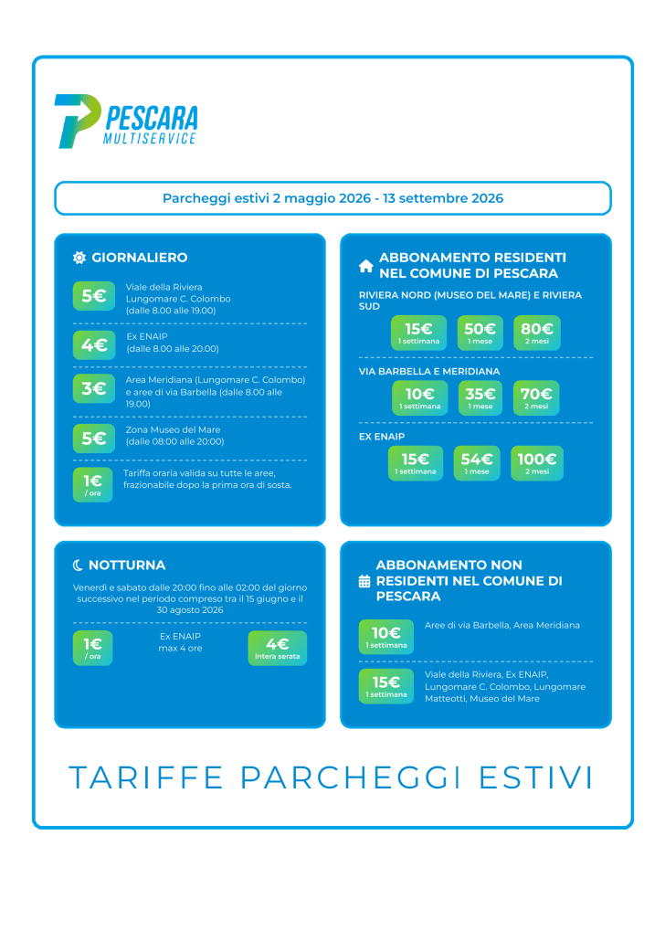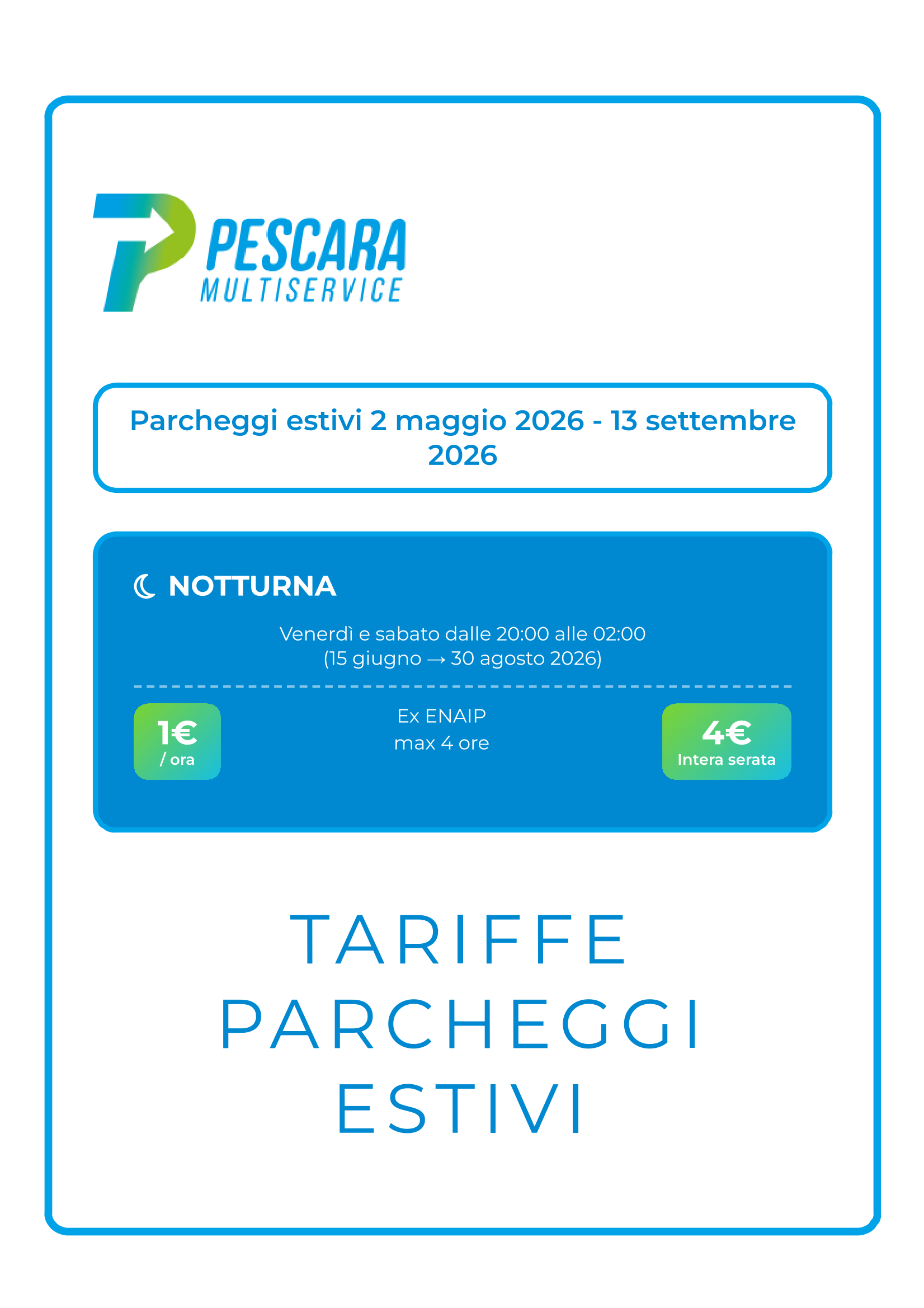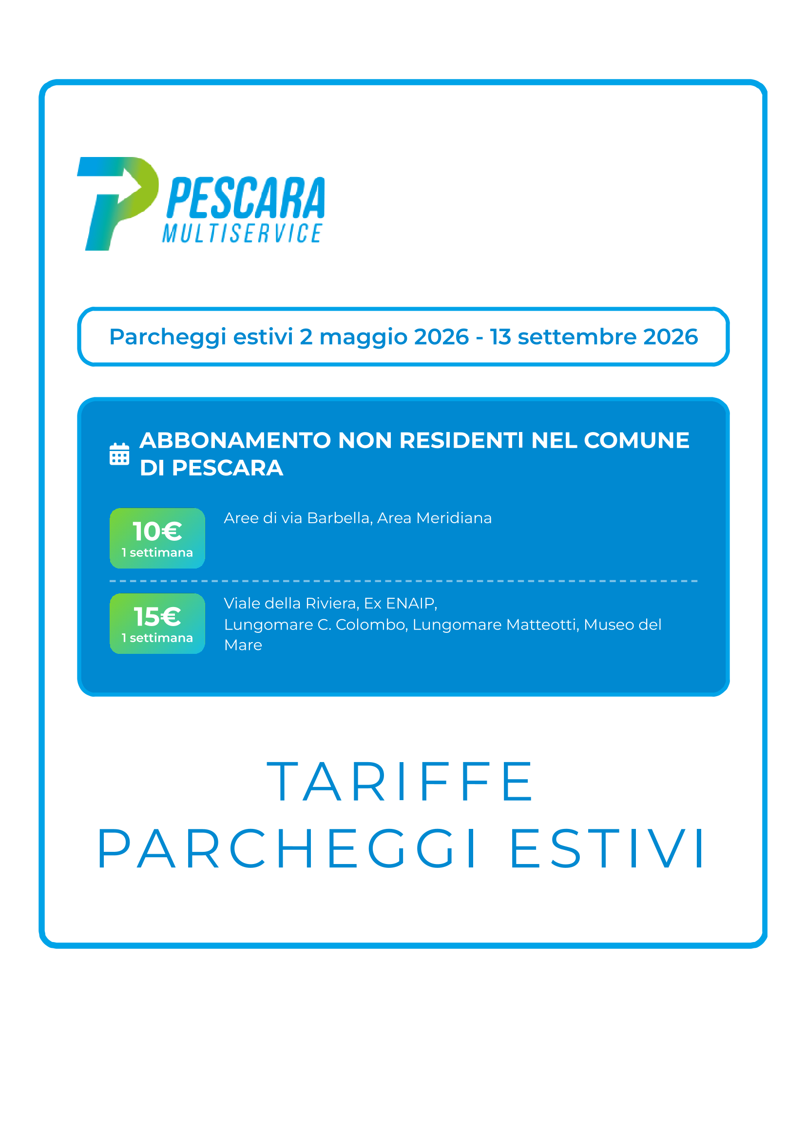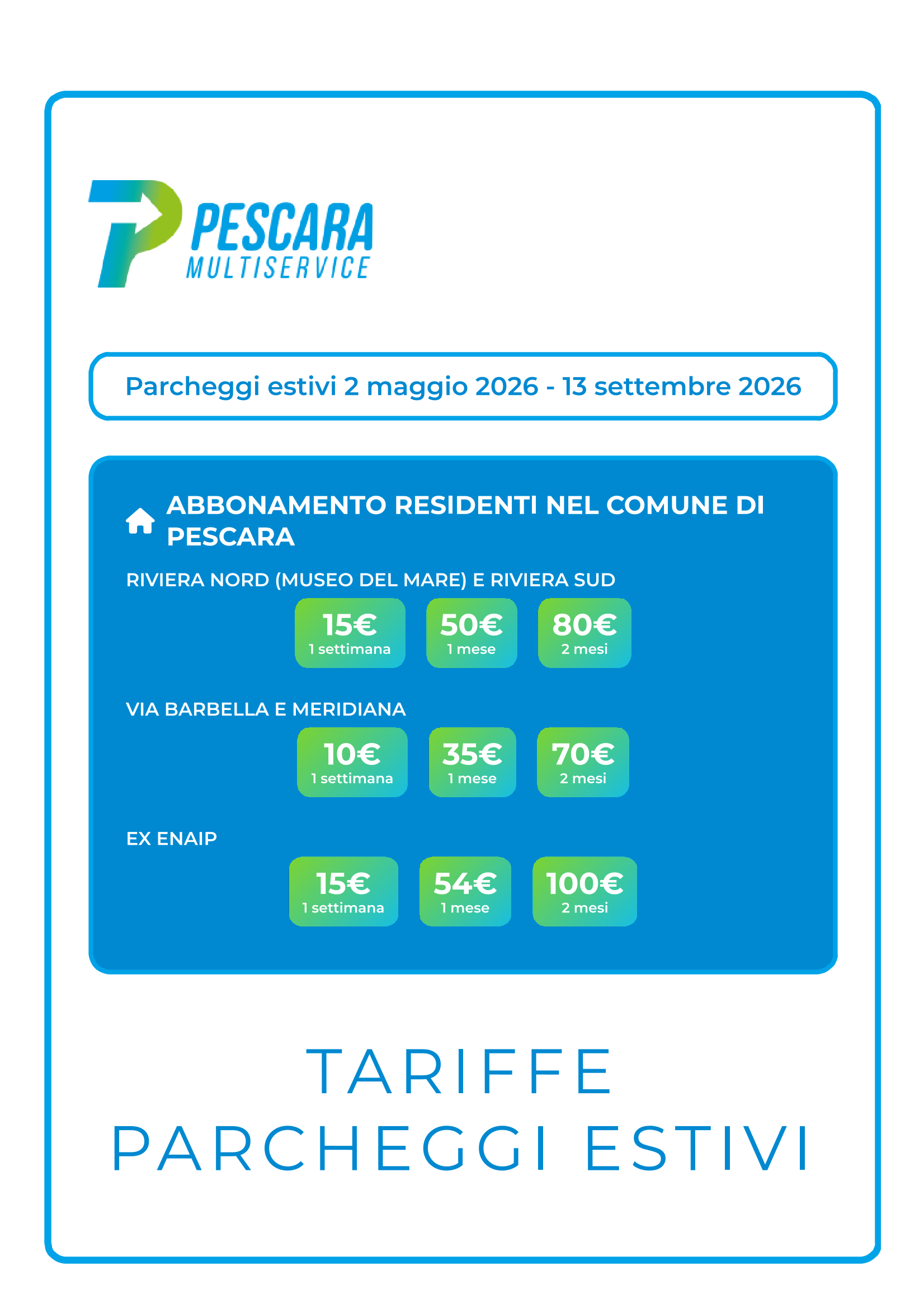 - un abbonamento per 60 giorni, riservato ai residenti nel Comune di Pescara, al costo di 70 euro per l’area del La Meridiana, al costo di 100 euro per le area dell’ex Enaip e di via Barbella, e al costo di 80 euro per tutte le restanti aree.