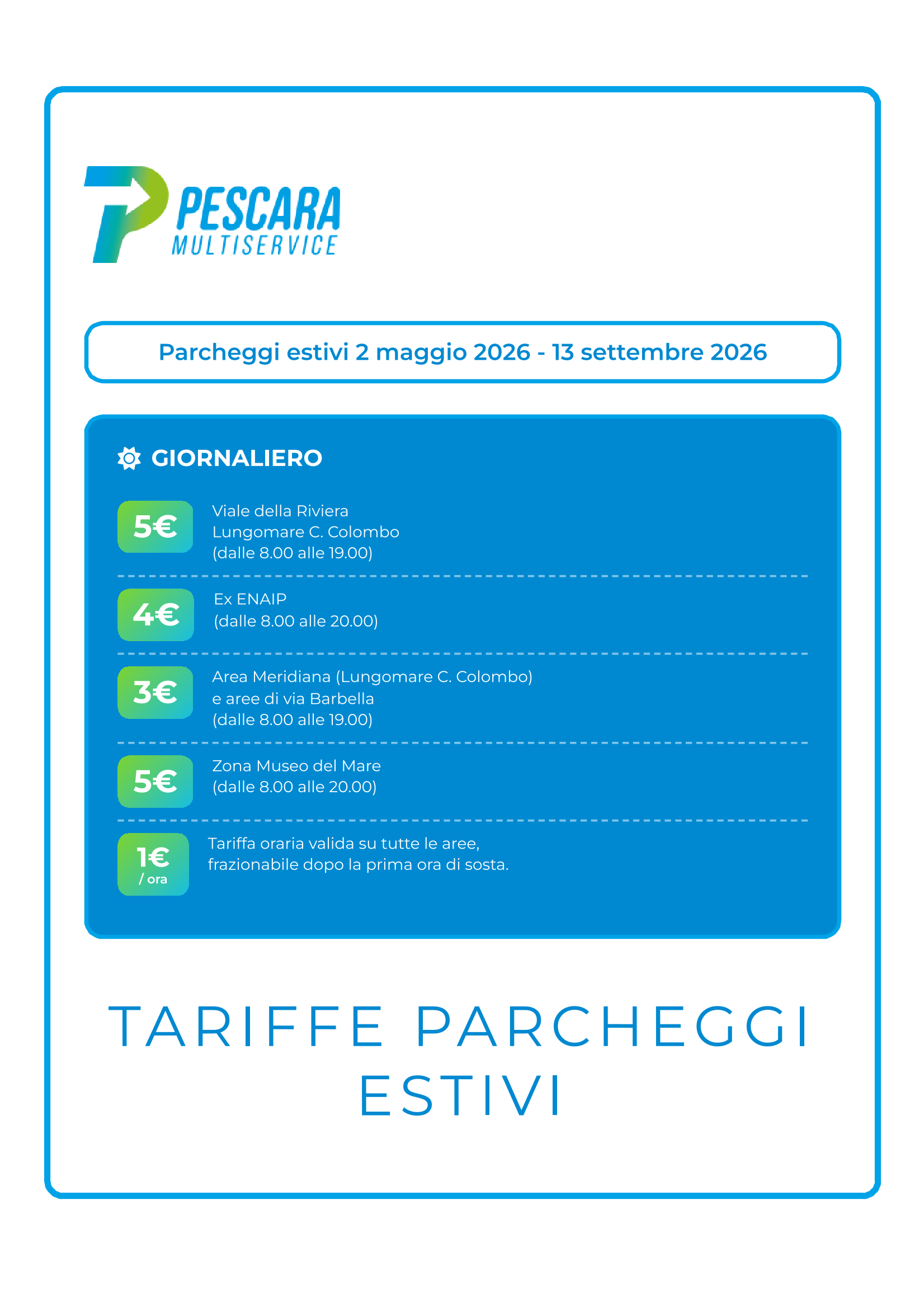 Anche per l’estate 2026 il Comune di Pescara ha destinato i posteggi alla sosta a pagamento sul litorale cittadino, affidandone la gestione a Pescara Multiservice.